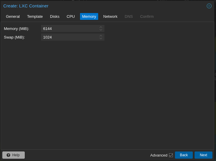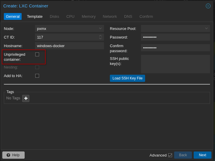Leave DNS setting as they are and confirm your choices but DO NOT start the container yet. Set these options first, Nesting and FUSE to on.