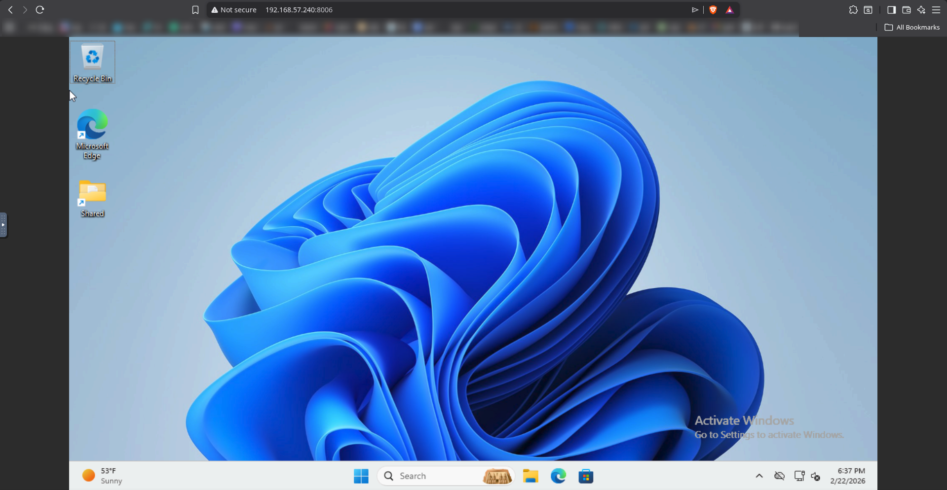 $ docker compose upI recommend not daemonizing the container just yet and just watching the install or if you do want to use the -d argument after up, watch the live Docker logs, as the process takes quite a while. After the image is pulled and fully extracted you can go to <your guest ip address>:8006 and watch the installation via browser (Dockurr has implemented a built-in noVNC viewer). After installation (and several auto reboots) you should be presented with something like below: